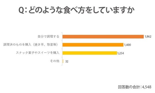 ・「どのような食べ方をしているか」という質問の回答は「自分で調理する」「調理済のものを購入(焼き芋、惣菜等)」「スナック菓子やスイーツを購入」の順に多かった(複数選択)。