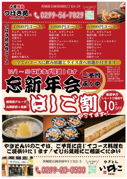 株式会社椿姫苑(代表:小林礼、本社:茨城県石岡市)は、「和牛焼肉酒家 椿姫苑」「大衆焼肉つばき苑」「やきとんいのこ」の3店舗で、11/20(水)より忘新年会の予約受付を開始します。
