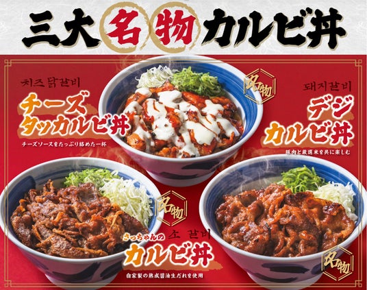 自家製秘伝の熟成醤油だれを使用した定番の「カルビ丼」、味わい深い豚肉と厳選したお米が相性抜群の「デジカルビ丼」、ジューシーな鶏肉にチーズソースをたっぷりかけた「チーズタッカルビ丼」。