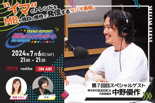「企業の情報と印象をデザインする」をコンセプトに掲げ、メディアとWEBとオフラインを融合させたマーケティング戦略を提供する、株式会社アナログPR(本社:東京都港区、代表取締役:松浦啓介)は、弊社企画のラジオ新番組「MBのトレンドレポート」(FM-NIIGATA)の第7回目のスペシャルゲストに、中野優作さんをお呼びして2024年7月6日(土) 21:00~放送することをお知らせいたします。