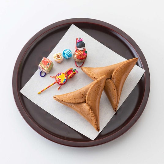 山形県庄内地方に伝わる伝統のお菓子で、三角形に折りたたまれた甘いお煎餅を割ると、中からちいさな民芸品の玩具が出てくる「からから煎餅」。その、「大福田展」バージョンをオリジナルで作りました! まわりのお煎餅を割ると、ちいさな伝統玩具と「オリジナルおみくじ」が出てきます。どんな「福」が出てくるかは、割ってからのおたのしみです。