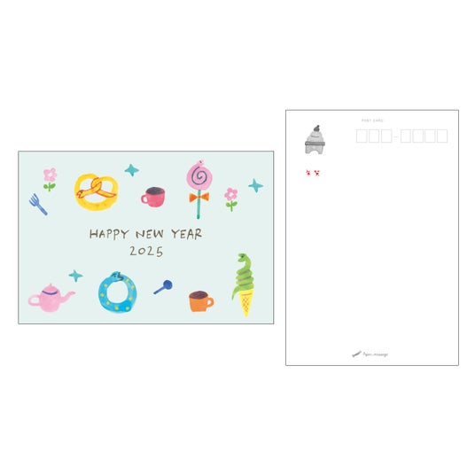 新年を明るく彩る、おやつに扮したヘビが描かれた年賀状。3枚入り。