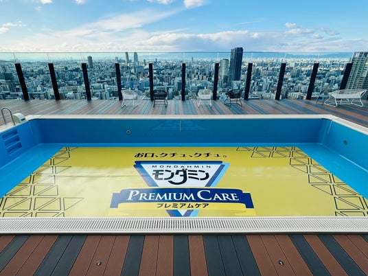 縦4.5m×横10.0m×深さ1.0mサイズのプールの底面にアース製薬「モンダミンプレミアムケア」のロゴをペイントし、遊泳やテラス利用者など、最上階プール利用者への商品の宣伝やフォトジェニックな撮影スポットとしても展開していく。また、2024年12月2日(月)の9:00~13:00の間に無料内覧会を開催し、「モンダミンプール」の見学もできる。