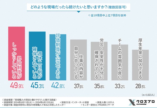 最後に、「どのような現場だったら続けたいと思いますか?(複数回答可)」と質問したところ、『昇給制度がしっかりしている(49.9%)』と回答した方が最も多く、『週休二日制が確保されている(45.3%)』『評価制度が公正である(42.8%)』と続きました。約半数がしっかりした昇給制度がある現場であれば働き続けたいと回答しました。職人が納得のいく昇給・評価制度を策定することや、適正な休みの確保が職人不足対策のために重要と言えそうです。