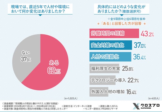 直近5年で人材や環境において変化があったと感じている方は約6割に上り、労働環境への変化を感じている一方で、現場の高齢化を実感している方が多く人材の確保が必要であることが示唆されました。