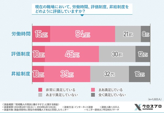 約7割が労働時間に、約6割が評価制度に満足していることが明らかになりました。一方で、昇給制度の満足度は評価が分かれることが示されました。