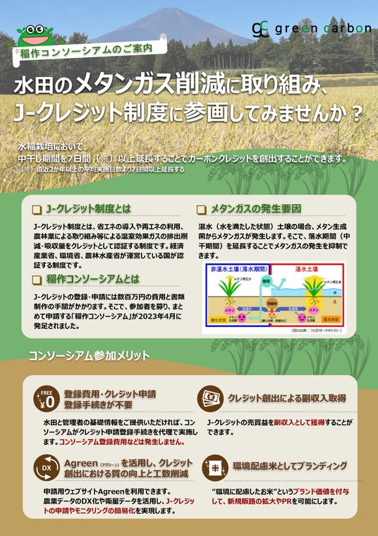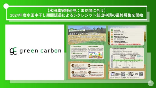 Green Carbon株式会社(代表取締役:大北潤、以下Green Carbon(読み;グリーンカーボン))は、水田農家様向けに、水田の中干し延長によるメタンガス削減の方法論を活用したJ-クレジット創出・登録申請の最終募集を水田農家様向けに開始しました。12月16日(月)中を期限とし、まだ手続きが完了していない農家様に向け、40,000haの国内水田農家ネットワークのノウハウを活用し、Green Carbonの専門スタッフによる迅速かつ丁寧なサポート体制で皆様を支援します。