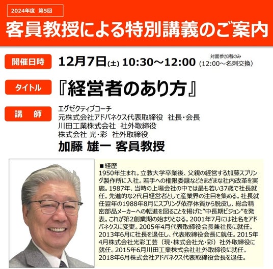 NSGグループ 事業創造大学院大学(以下「本学」、新潟市中央区米山3-1-46)では、一般の方も無料で参加できる特別講義を開催いたします。参加方法は対面およびオンラインのいずれかを選択可能。今回は、加藤雄一客員教授(エグゼクティブコーチ/元株式会社アドバネクス代表取締役 社長・会長/川田工業株式会社 社外取締役/株式会社 光・彩 社外取締役)が登壇いたします。