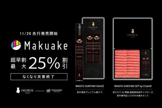 第一弾商品として、和牛すき焼き専用のプレミアム割下「WAGYU SUKIYAKI SAUCE」と、和牛オーダーカット専門店「Club29」とダックを組み、一頭買いの国産黒毛和牛を一切冷凍せず、切りたての状態でお届けするすき焼きセット「WAGYU SUKIYAKI SET by Club29」を、Makuakeにて11月26日(火)12時00分より先行販売を開始いたします。