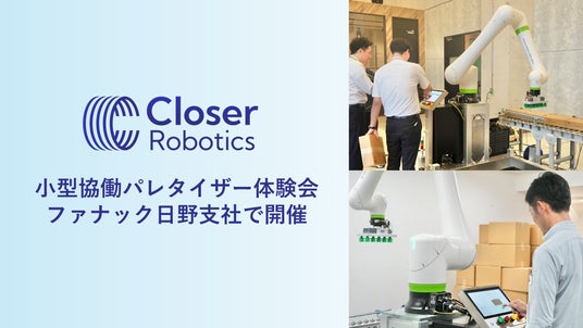 AIロボット開発の株式会社Closer(代表取締役:樋口翔太、本社:茨城県つくば市、以下「Closer Robotics」)は、2024年12月に、東京・ファナック日野市社にて、小型パレタイズロボット「Palletizy(TM)(パレタイジー)」の体験会を開催します。