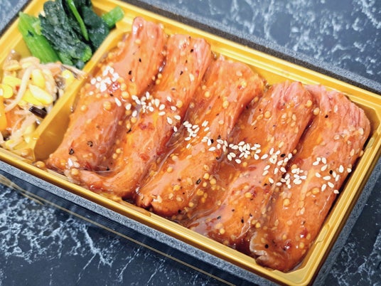 希少部位トモサンカクを使用したローストビーフをのせた贅沢なお弁当です。柔らかくジューシーな肉とタレが食欲をそそります。