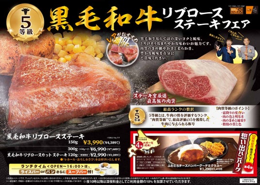 コロワイドグループの株式会社アトム(本社:神奈川県横浜市、代表取締役社長:田中公博)は、ステーキ宮全店112店舗で、2024年11月26日(火)から「5等級黒毛和牛リブロースステーキフェア&想い出ハンバーグ第4弾」を実施いたします。