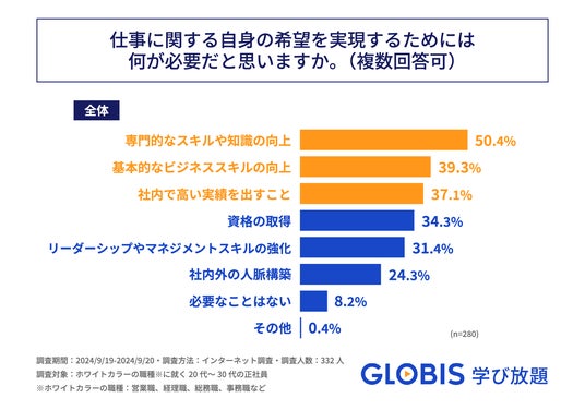 今後5年以内に実現したいことがあると回答された方に「仕事に関する自身の希望を実現するためには何が必要だと思うか」を尋ねたところ、1位が「専門的なスキルや知識の向上」で50.4%、2位が「基本的なビジネススキルの向上」で39.3%、3位が「社内で高い実績を出すこと」で37.1%という結果になりました(図7)。