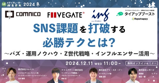 株式会社アイズ(所在地:東京都渋谷区、代表取締役社長:福島範幸、東証グロース:5242)が運営するNo.1*の広告業界のプラットフォーム「メディアレーダー」が主催するマーケティングセミナーイベント「第16回メディアレーダーWEEK 2024 冬」にて、SNSマーケティングについての専門家たちが12/11(水)に登壇します。視聴申し込みは無料です。