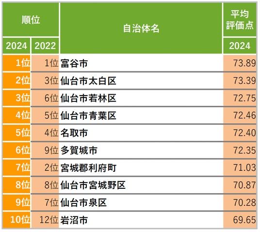 株式会社リクルート(本社:東京都千代田区 代表取締役社長:北村 吉弘)では、宮城県に居住している人を対象に実施したWEBアンケート形式による「SUUMO住み続けたい街ランキング2024 宮城県版」を集計しました。概要をまとめましたので、ご報告いたします。本調査は住まい探しの際に新しい街の魅力に気づくきっかけや、街を選択する際の参考になればと、「住んでいる街に住み続けたいか」という“継続居住意向”に関する実態を調査したものです。隔年で調査を実施しており、この手法で調査したのは今回で2回目です。