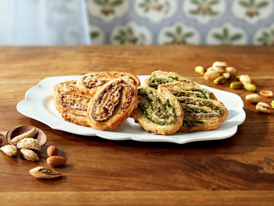2種の木の実の味わいを堪能。ヘーゼルナッツとチョコレートで仕立てたジャンドゥーヤのペーストとアーモンドダイスを重ねた「ジャンドゥーヤ」と、香ばしくまろやかな味わいのピスタチオのペーストとダイスを重ねてロールし、さっくりと焼き上げた「ピスタチオ」の2種入りです。