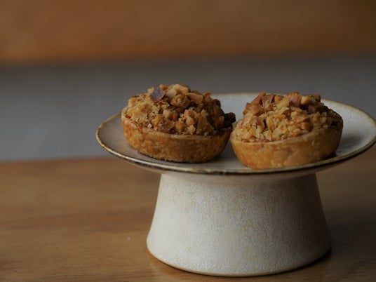 マカダミアナッツとあんこを掛け合せて「マカダミアん」。求肥とつぶあん入りのアーモンドクリームを、パイのようなサクサク生地にのせて焼き上げました。バターとあんこの風味、ナッツの香ばしさが広がる、新感覚のタルトです。