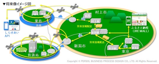 粟島<ドローンよる高速発送>→岩船港→新潟駅<上越新幹線を活用した荷物輸送サービス「はこビュン」>→東京駅→銀座 新潟情報館「THE NIIGATA」