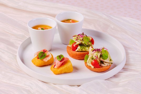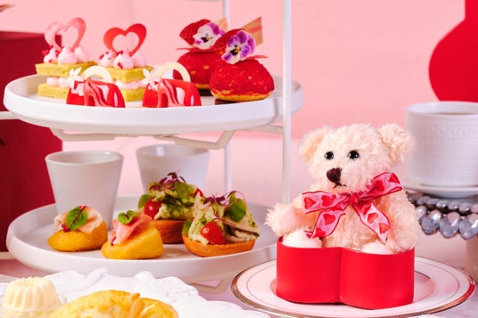 スイーツはミルクのパンナコッタといちごジュレ、フレッシュいちごで構成したグラデーションが美しいヴェリーヌや、いちごクリームを軽い食感のメレンゲでサンドし、ぽてっとした愛らしい形のパブロバ、ハートチョコのオーナメントが目を惹くショートケーキ、アイコニックな鞄型のフランボワーズムースなどの6種をご用意。特製セイボリーには、生ハムの塩味とラズベリーの甘酸っぱさがアクセントのカマンベールフライ、鶏ムネ肉をジェノバ風に仕上げたオープンサンドなど3種をご堪能いただけます。