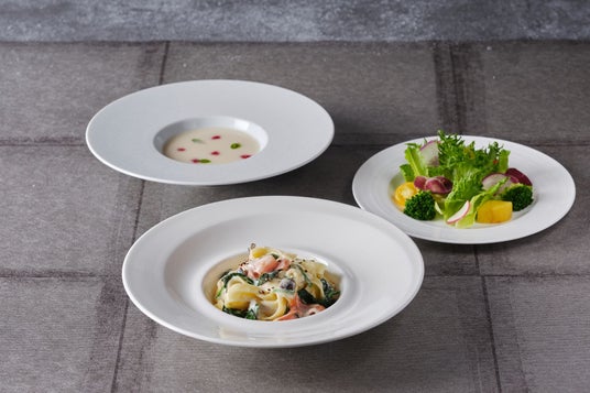 ランチA:スモークサーモンとほうれん草のクリームパスタ/カブとフランボワーズのスープ/根菜の彩りサラダ すりおろしキャロットドレッシング