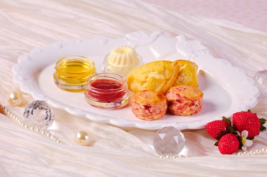 ストロベリー&ラズベリーとプレーンを楽しめる2種のスコーン、塩味を効かせたクロテッドクリーム、苺のジャム、はちみつの3種のコンディメントをご用意。外はサクッと、中はしっとりしつつも軽い食感のスコーンとあわせてお召し上がりいただけます。