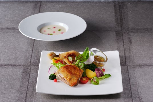 ランチB:鶏もも肉のコンフィと根菜の彩りサラダ レモンマスタードドレッシング/カブとフランボワーズのスープ
