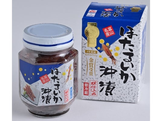新鮮なほたるいかに醤油とみりんを加えて深層水に仕込み、コクと旨味をのせた塩辛。目玉をとり除いてあるので食べやすい。