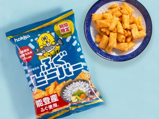 北陸で愛される揚げあられ「ビーバー」。能登町で養殖したふぐの王様「とらふぐ」を使用。ネギの風味と爽やかな酸味が効いた、ふぐ刺し味のビーバーです。
