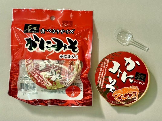 食べきりサイズのかにみそレトルトカップ入り。かに身入りで、風味が濃厚。スプーン付きでこのまま食べられるので、列車の旅のお供にも。
