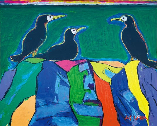 世界を自由に往来する、生き物の声に耳をすませてみましょう。大地の多様性と生命力を育む大らかさ。海の神秘的で深淵な世界。そして人間の夢や希望を象徴する存在としての空。豊かな表情の生き物や、多彩な色の組み合わせの風景、またそれらが溶け合う創造性に富んだ作品群は、自然界の驚異と美しさ、そしていのちの輝きそのものを伝えます。