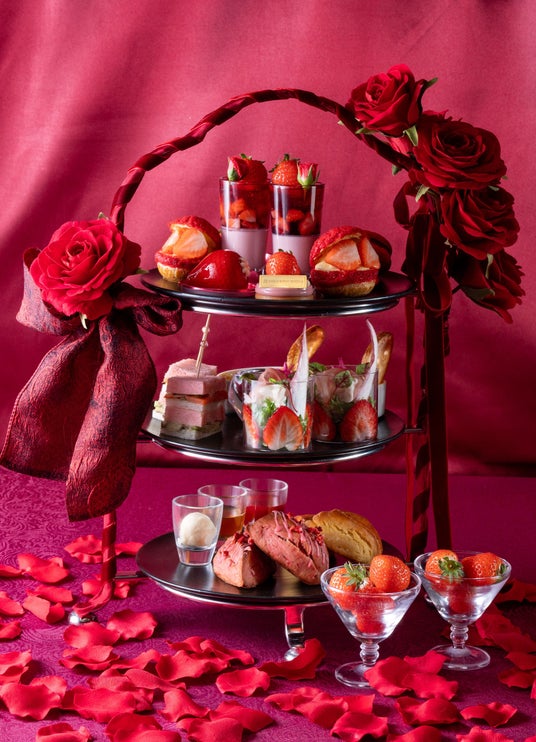 前半の1月6日(月)~3月16日(日)のテーマは「赤とバラ」。真紅のバラで装飾された「苺のアフタヌーンティー~赤とバラ~」をご用意します。
