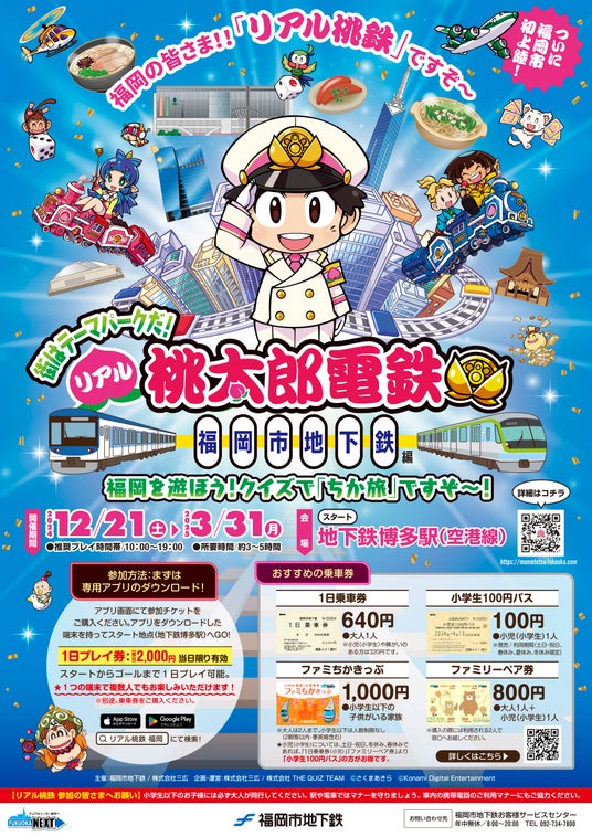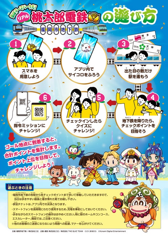 株式会社三広、株式会社THE QUIZ TEAMと福岡市地下鉄がタッグを組み、大人気ゲーム桃太郎電鉄(発売元:株式会社コナミデジタルエンタテインメント)とコラボしたリアル桃太郎電鉄を実施します。