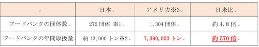一方、アメリカのフードバンクの年間食品取扱量は739万トンで、これは国内の食品ロス発生量(472万トン)より多く、国内フードバンク取扱量の570倍に相当します。このように、アメリカではフードバンクが膨大な量の食品ロス削減と、経済的な困難を抱える世帯への食料供給に大きく貢献しています。