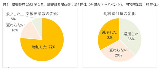2023年2月に行った調査では、支援要請数が「増加した」と回答した団体は7割を超え、食料寄付量が「減少した」と回答した団体が3割を占めていることが明らかになりました(図3)。