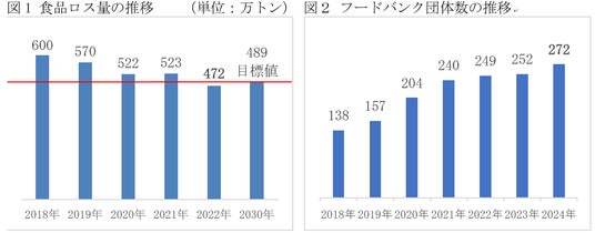 2024年6月21日、政府は2022年度の食品ロス量が472万トンという最新の数値を発表し、前年度(2021年度)の523万トンを大きく下回り、2030年までの政府削減目標値(489万トン)を8年前倒しで達成したことを公表しました(図1)。また、農林水産省ホームページの「フードバンク活動団体一覧」に掲載がある通り、2024年5月時点でフードバンク団体数は272団体に拡大しました(図2)。