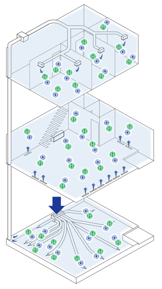 2.換気システムのガードを超えて侵入する有害物質や、衣服への付着や窓を開けているときに侵入する有害物質には、空調機本体に搭載されている高濃度イオン発生装置で低減・抑制を行います。高濃度イオンは空調機から送風される空気によって家全体に行き渡ります。