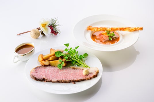 ブッフェに加え、しっとりと仕上げたローストビーフと贅沢な海の幸を使用したオマール海老と北海道産平目のビスクからメイン料理をお選びいただけます。