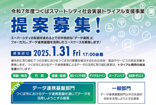 つくば市では、国が提唱する「Society 5.0」という未来社会の実現に加え、「スマートシティ」、「つくばスーパーサイエンスシティ構想」の実現を一層加速することを目指し、先端技術のトライアル(実証実験)を全国から公募し、優れた提案を全面的にサポートしてきました。令和7年度は、データ連携基盤を通じてデータを活用する「データ連携基盤部門」を新設し、本市の課題解決に資する提案を全国から募集します。
