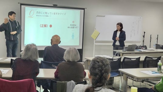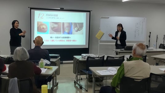 今回の社会生活教室は、仙台市聴覚障害者協会の依頼を受け、株式会社マルナニエが開催したものです。視力や握力の低下、屈めないなどの理由で足の爪を自分で切ることが出来ずに困っている高齢者=「爪難民」は全国に約700万人いると言われています。中には2年以上、爪を切らずに放置しているケースも珍しくなく、厚く硬く変形した爪が原因で、靴下や靴が履けず、外出しなくなるという悪循環に陥る可能性があります。