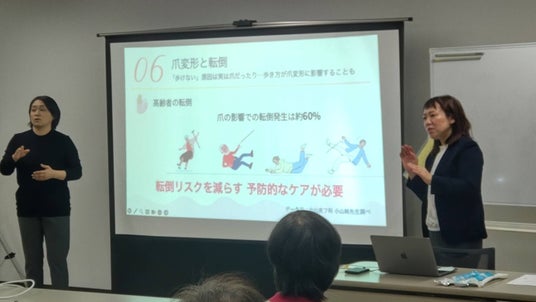 今回の講演会は、2名の手話通訳者と共にお伝えしました。文字よりもイラストが多いスライドを作成し、動画資料を取り入れるなど、伝わりやすい内容を心掛け、手話通訳者の方とスピードや間の取り方が合うようにゆっくりとお伝えするようにしました。お伝えした内容について参加者の皆さんが手話で感想を伝え合う様子を拝見した際は感激でした。爪ケアについてお伝えすることの重要性を再確認しましたので、今後も講演等を通じて幅広い世代の皆様に向けて発信を続けてまいりたいと思います。