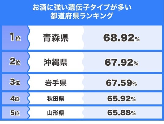 「お酒に強い遺伝子タイプが多い都道府県ランキング」では東北と沖縄が上位に