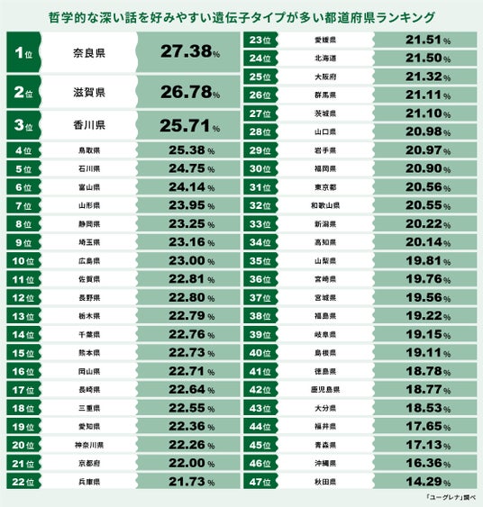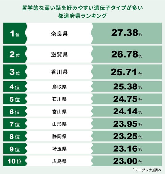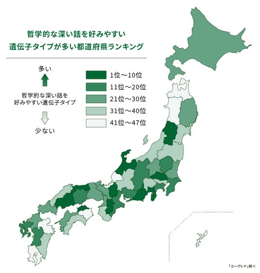 また、これに伴い、ユーグレナ・マイヘルスとジーンクエストの遺伝子解析サービスのゲノムデータをもとにした「哲学的な深い話を好みやすい遺伝子タイプが多い都道府県※2ランキング」を公開します。