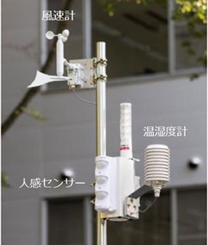 2016年度には、環境センサー「ウェザリー」をメーカーと共同開発し、施工現場への導入を開始しています。「ウェザリー」は、温湿度・風速・人感センサーが内蔵され、基準値を超える温湿度を検知すると、表示灯と音声による警告と同時に管理者へメールで通知するため、遠隔地からでも状況を把握できます。