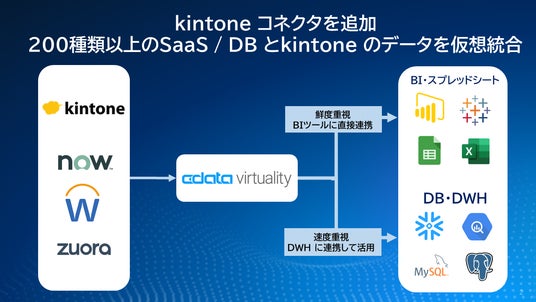 CData Virtuality は日本向けの対応を強化した最新のアップデートとして、日本の企業において広く導入されているkintone 向けのコネクタを追加しました。これによりユーザーは200種類以上のSaaS やデータベースとkintone のデータを仮想統合して、BI ツールやスプレッドシートなどからデータを分析・活用できます。