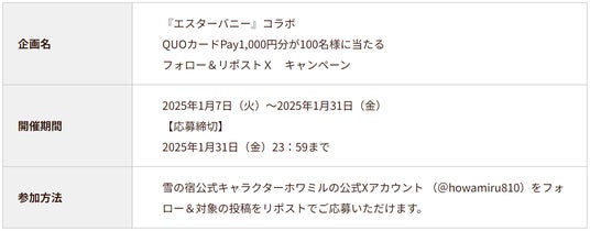 上記のキャンペーン期間に合わせて、ホワミル公式X(旧:Twitter)で『エスターバニー』とのコラボキャンペーンを開催いたします。企画詳細については、キャンペーンサイト内「キャンペーン2」またはホワミル公式アカウント(@howamiru810)の投稿をご確認ください。