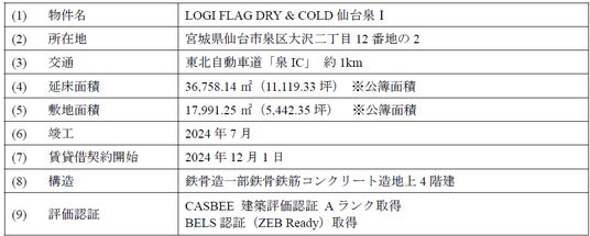 霞ヶ関キャピタル株式会社(本社:東京都千代田区、代表取締役:河本幸士郎、以下「当社」)は、当社が開発用地のソーシングおよび企画立案をおこない、アセットマネジメント業務を受託している宮城県仙台市の物流施設『LOGI FLAG DRY & COLD 仙台泉I』の一部区画におきまして、株式会社 ササキ(本社:山梨県韮崎市、代表取締役:佐々木 啓二)がテナントとして決定いたしましたので、お知らせいたします。