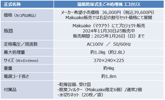 世界的なモノづくりの町・新潟県三条市の製造メーカー、株式会社SANKA(本社:新潟県三条市 代表取締役:神子島岩男)は、業務用機器開発で長年培った経験と技術を活かした家庭用新製品として、独自のドライヒートテクノロジーで生ごみを温風乾燥、脱臭・軽量・少量化を実現する、「温風乾燥式生ごみ処理機 エコカリス」を2024年11月30日、アタラシイモノのや体験の応援購入サービス「Makuake(マクアケ)」にて発表。