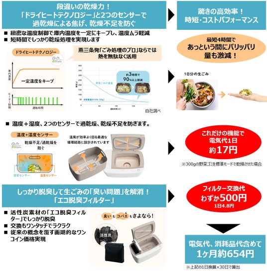 「温風乾燥式生ごみ処理機 エコカリス」は、生ごみを温風乾燥することで、量も臭いも抑える生ごみ処理機。これまでなかなか両立しなかった「乾燥力」と「コストパフォーマンス」を両立させた画期的な製品です。