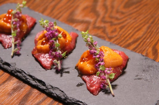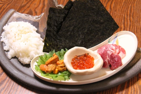 極上焼海苔を使った うにく手巻き寿司 時価海苔ソムリエの作る、熊本県有明産の極上焼海苔を使用した手巻き寿司です。その時期一番の雲丹といくら、さらには純国産の馬刺しを贅沢にお楽しみいただけます。