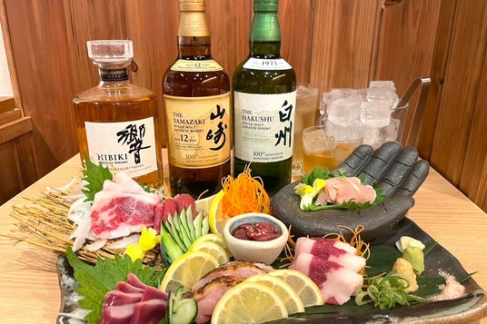 また、セットで提供する満開にほんいち盛りは、にほんいちの名物である純国産生馬刺しと朝引き鶏の刺し身の盛り合わせです。なかなか口にする機会の少ない山崎や白州と合わせる食事はまさに大人の至福。ぜひ希少なウイスキーと合わせて贅沢なひとときをお過ごしください。